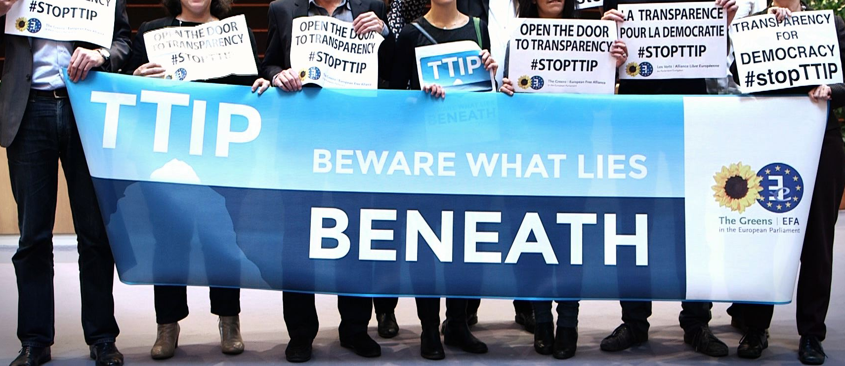 Mitglieder des EU-Parlaments demonstrieren dagegen, dass sie keinen Einblick in den Verhandlungsprozess von TTIP erhalten (Oktober 2014) [Ausschnitt].