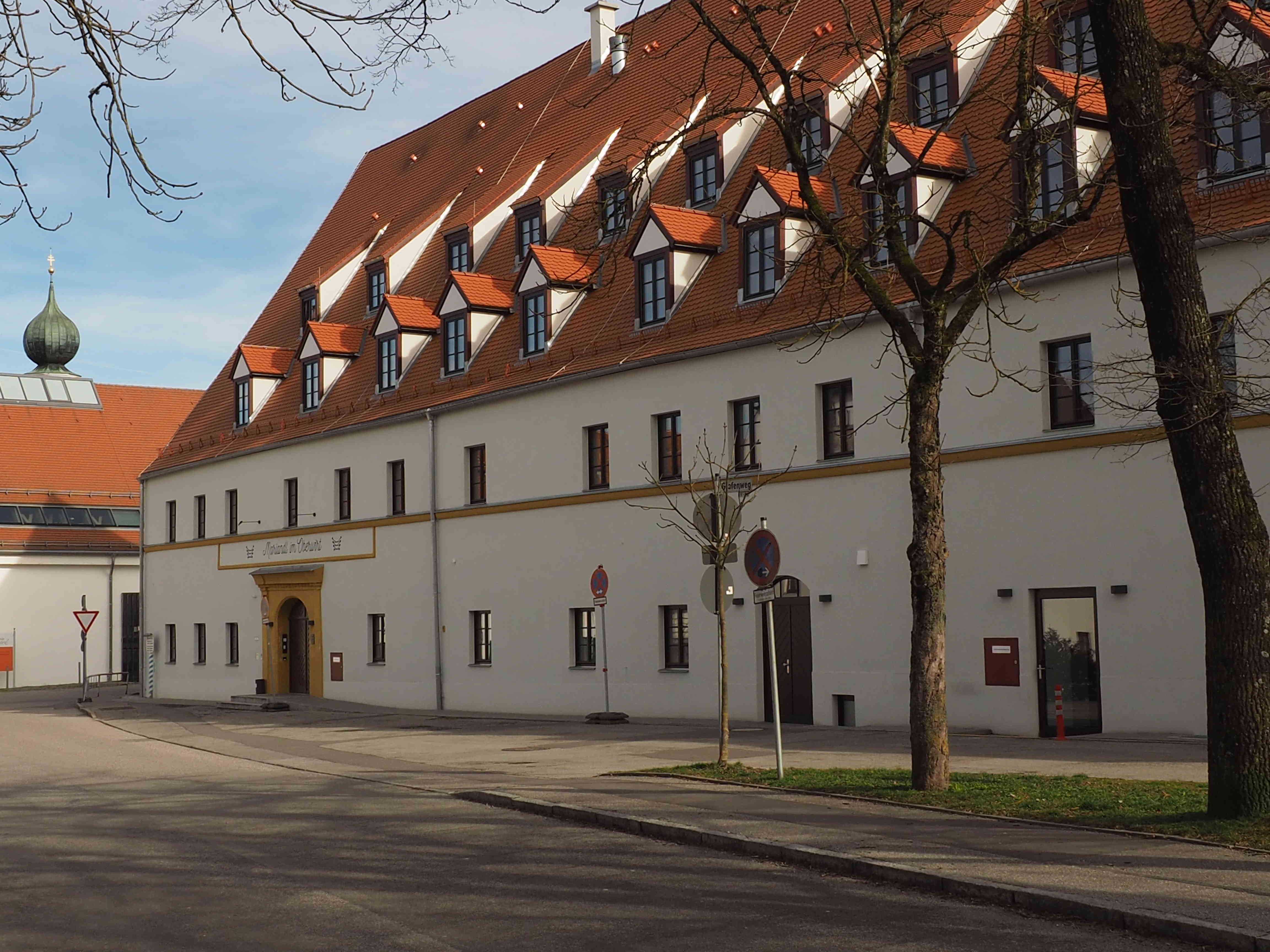 Auch die repräsentativen Massivbauten mit steilen Satteldächern, Gotischer Kasten und Hofmarkstaverne (Hofmark 34-40),