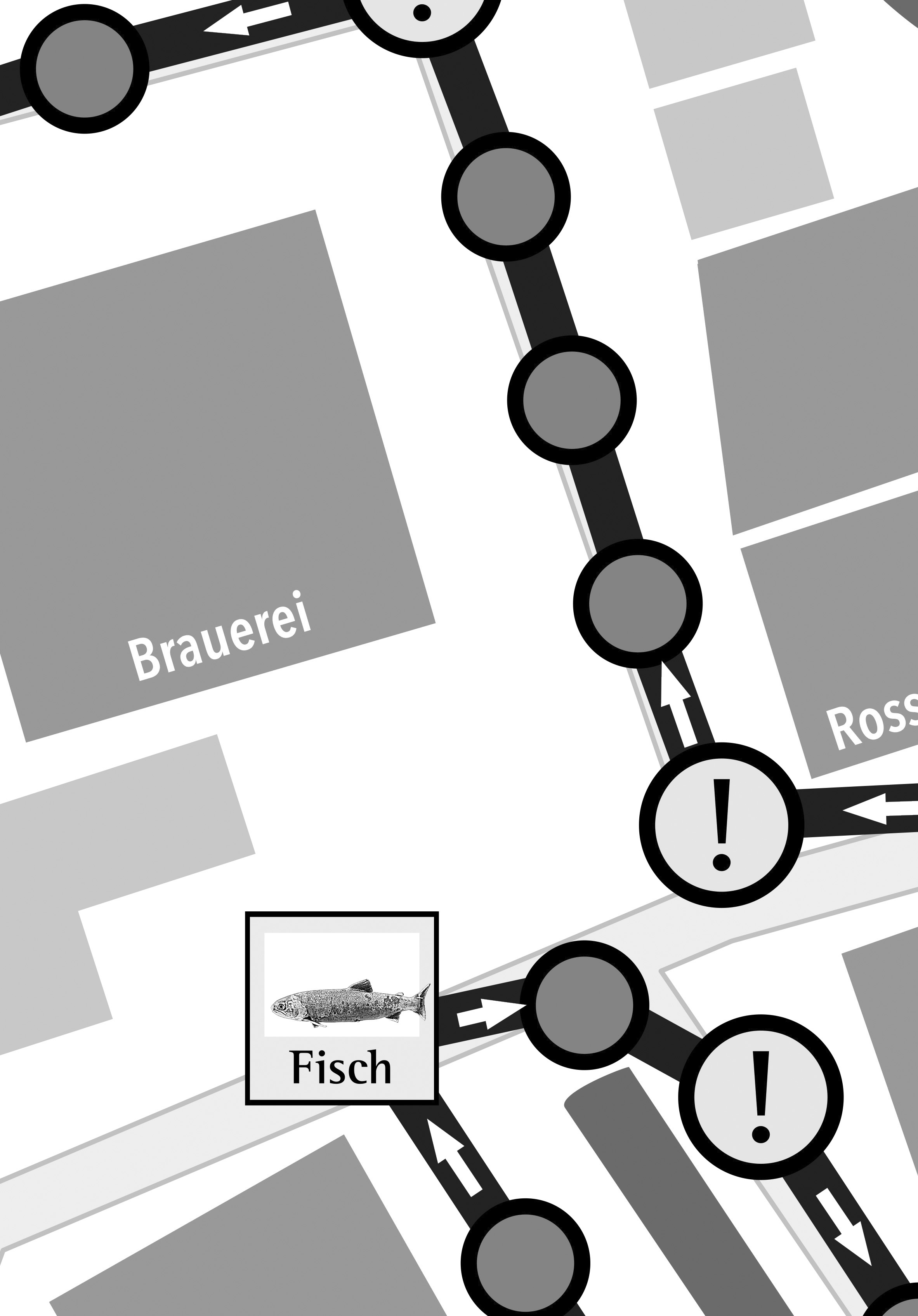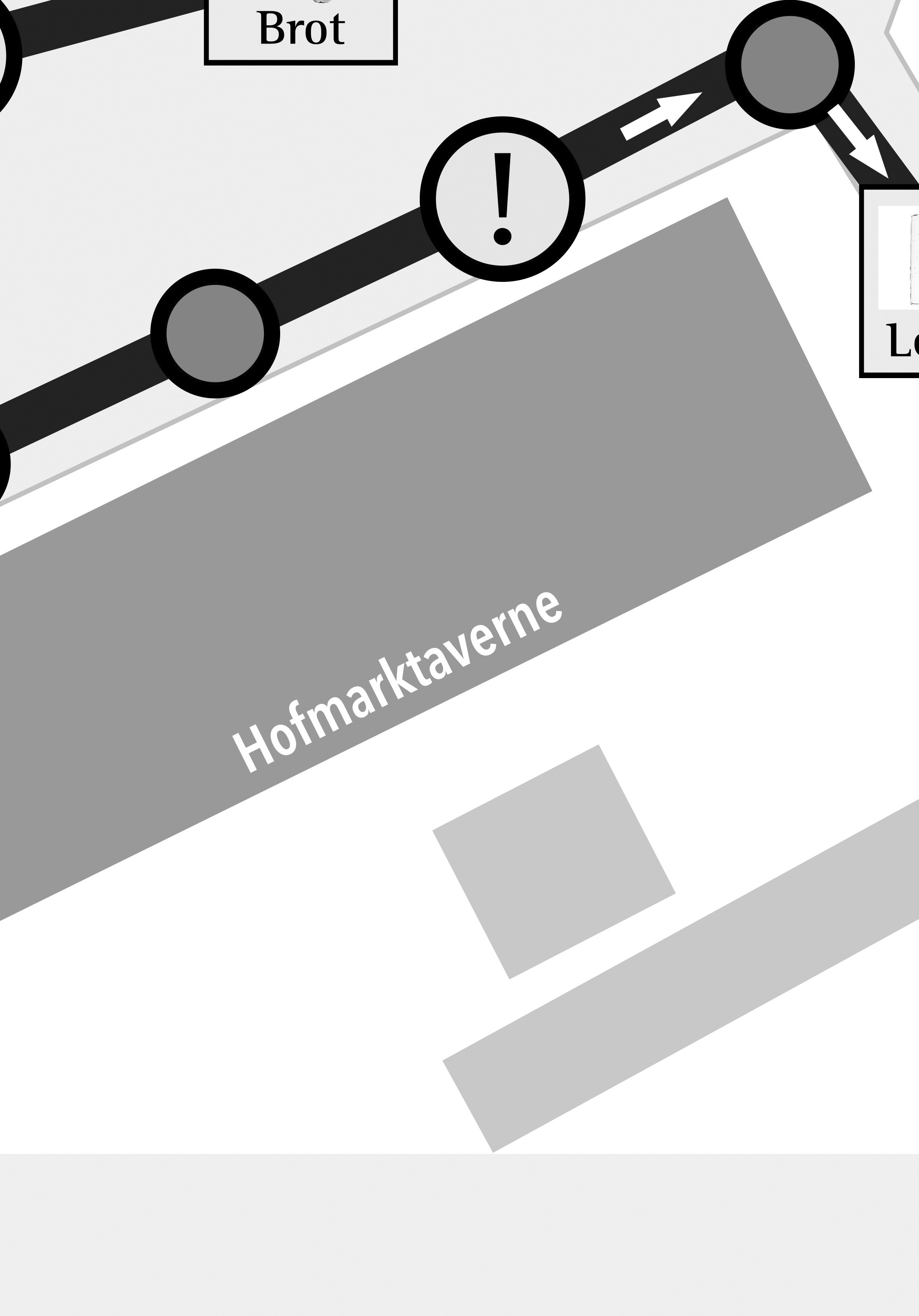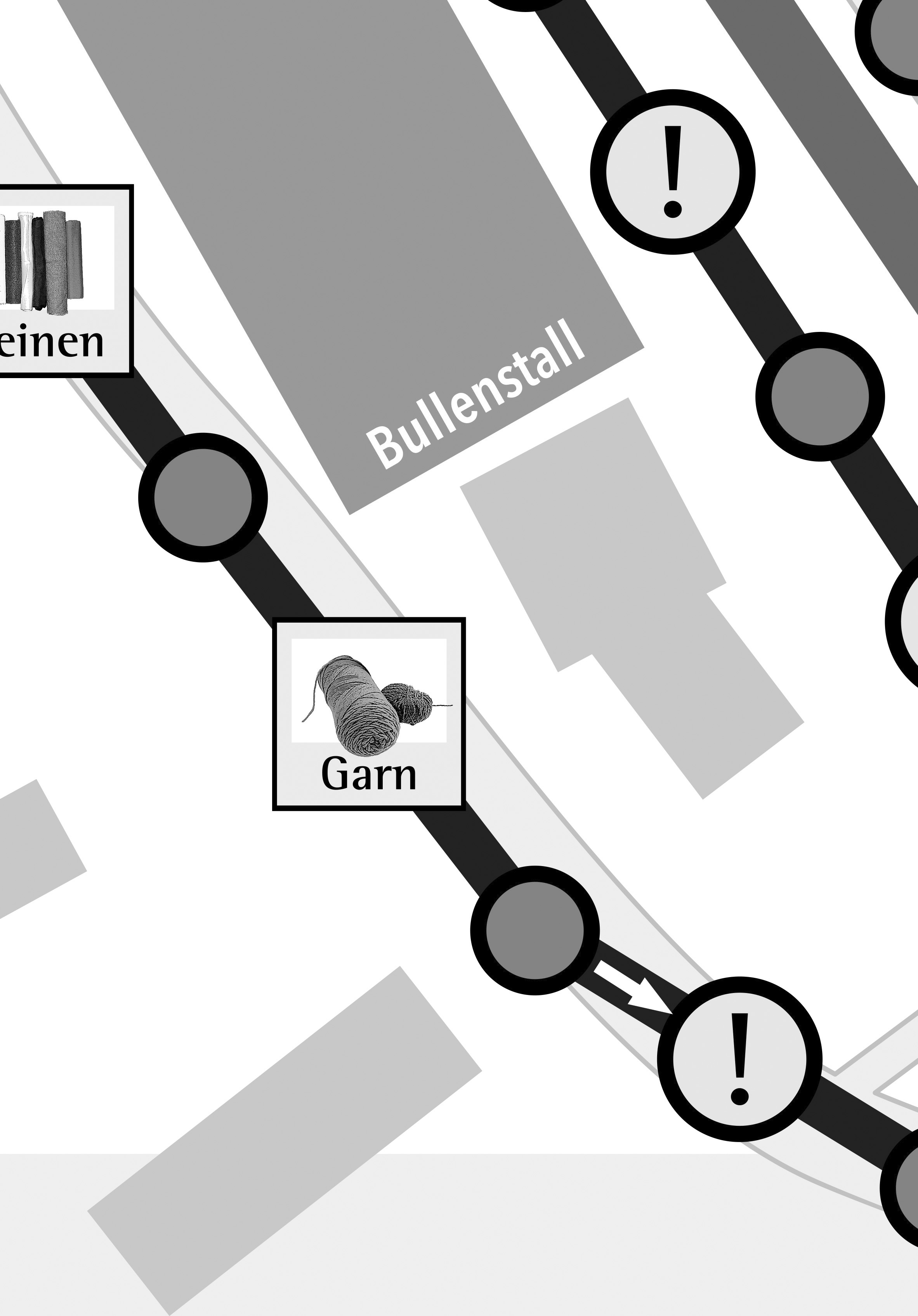 Die Route ist ein „Markt-Rundgang“, die an grafisch gesetzten „Ständen“ vorbeiführt;