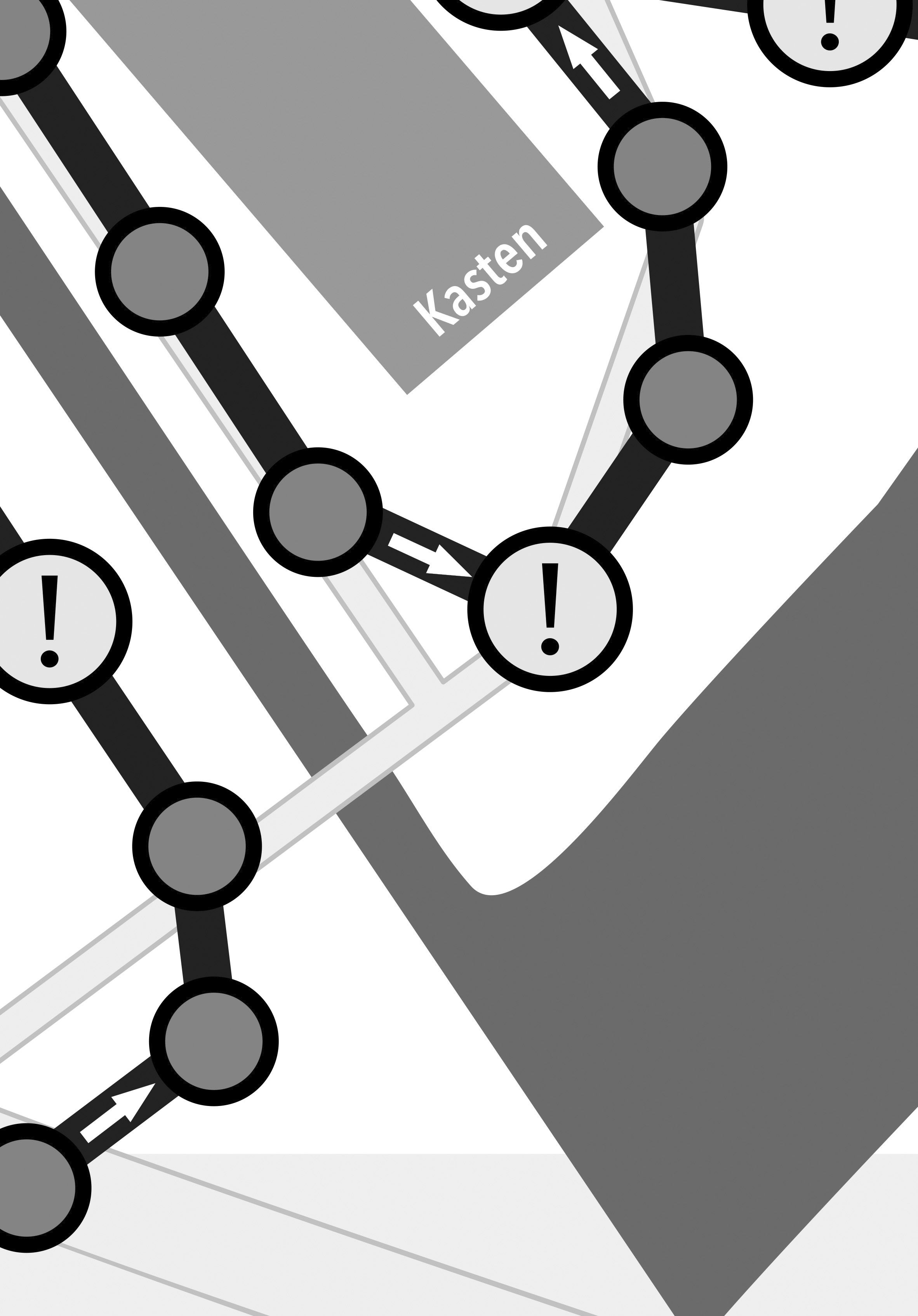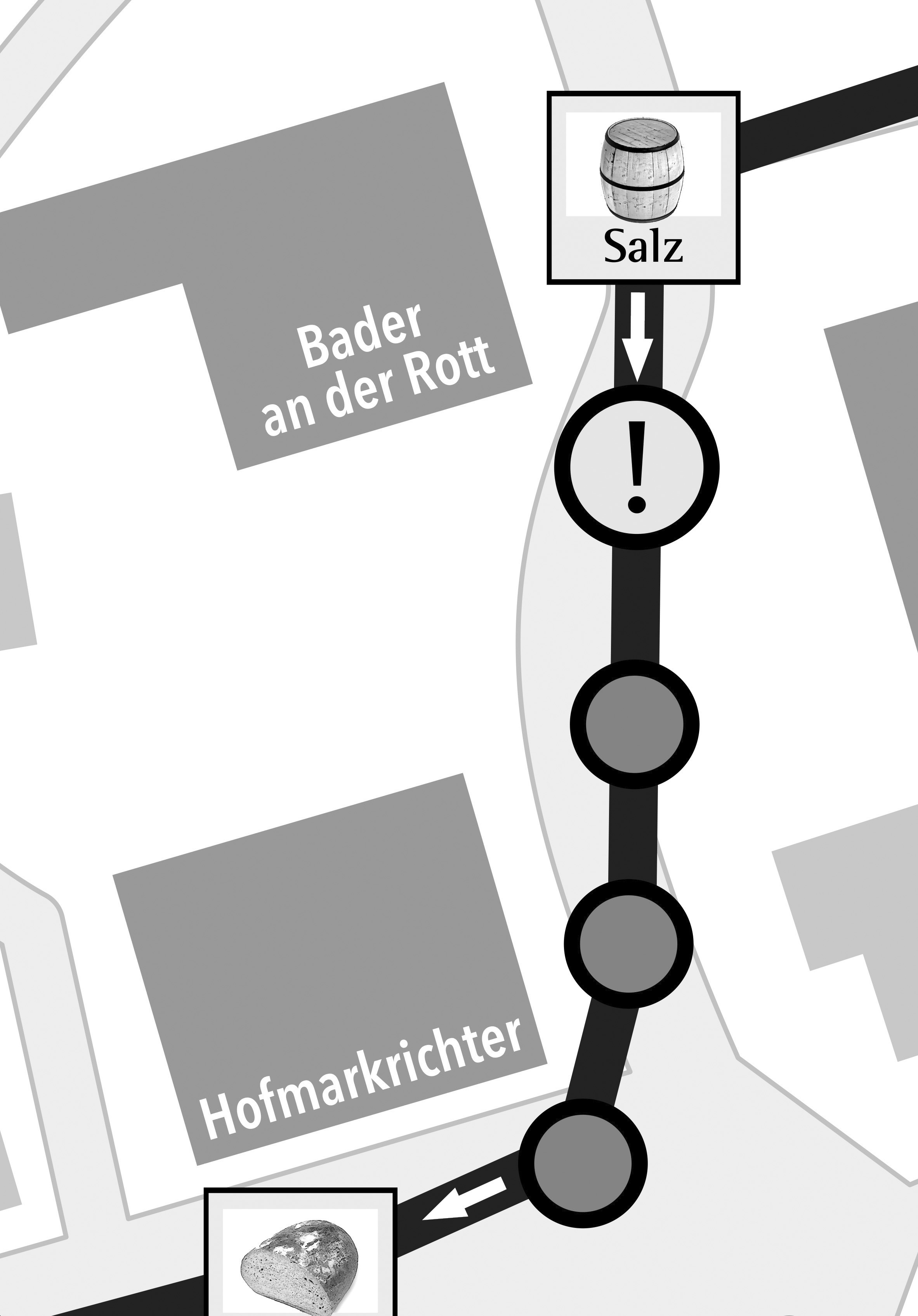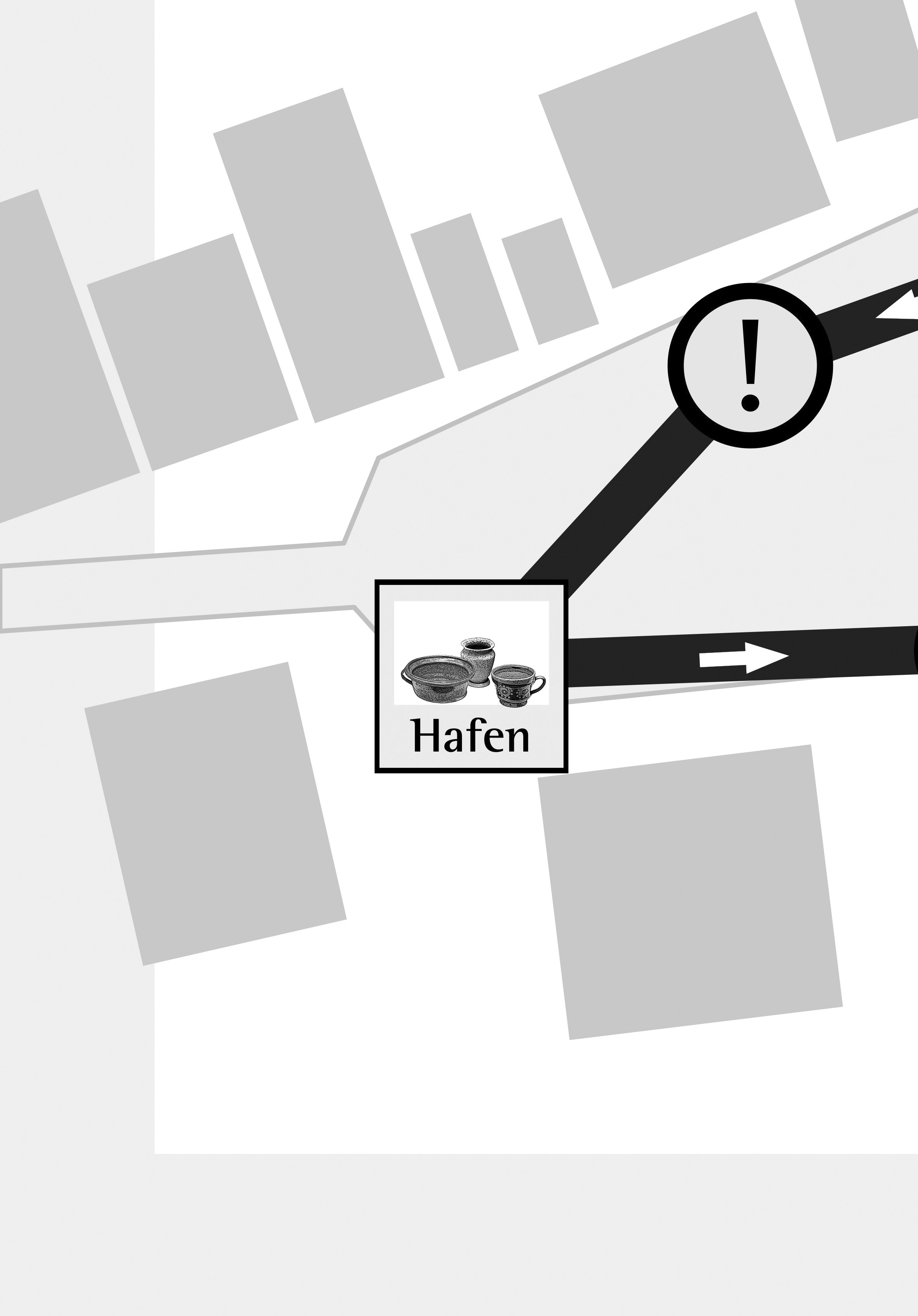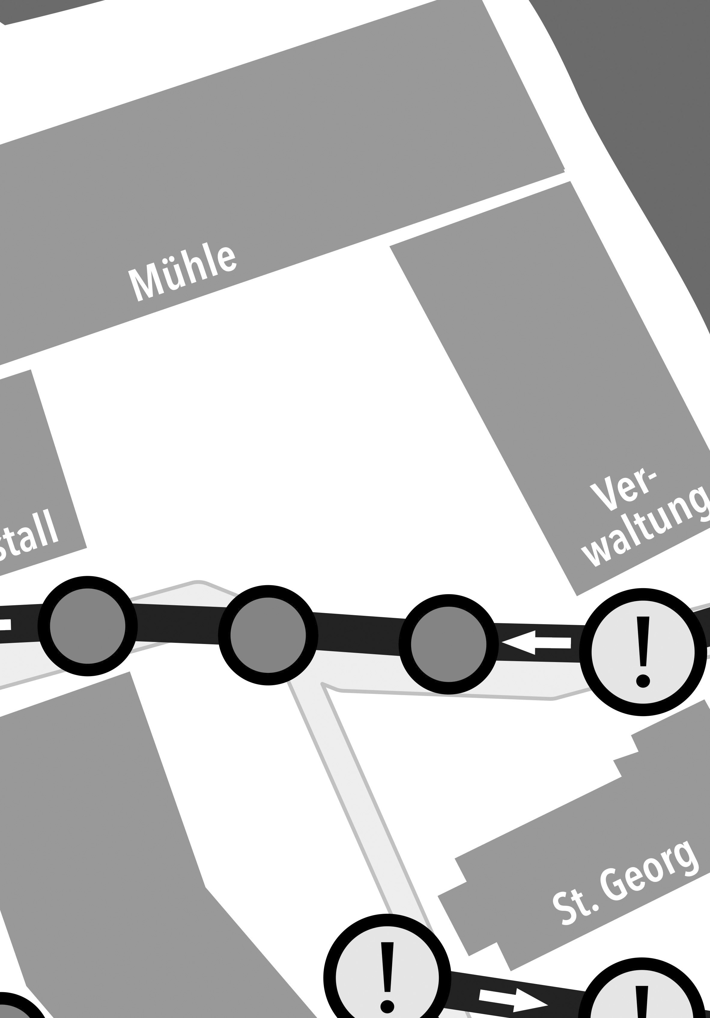 Die Route ist ein „Markt-Rundgang“, die an grafisch gesetzten „Ständen“ vorbeiführt;