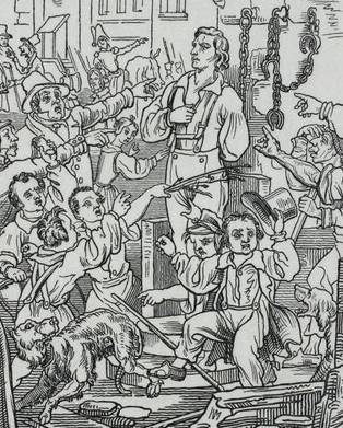 Ein Mensch ist an den Pranger ge-kettet worden.
